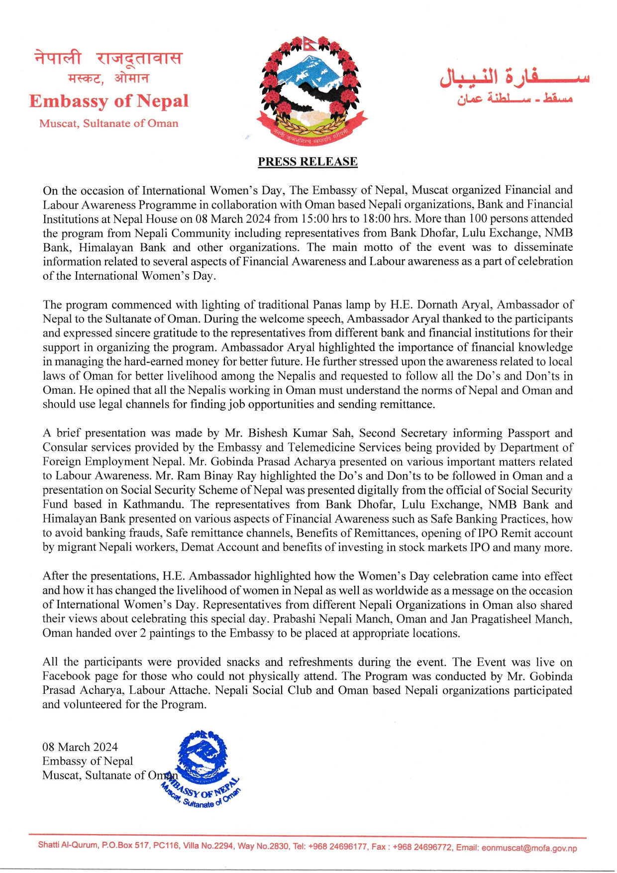 Press Release- Financial and Labour Awareness Program by EoN, Muscat