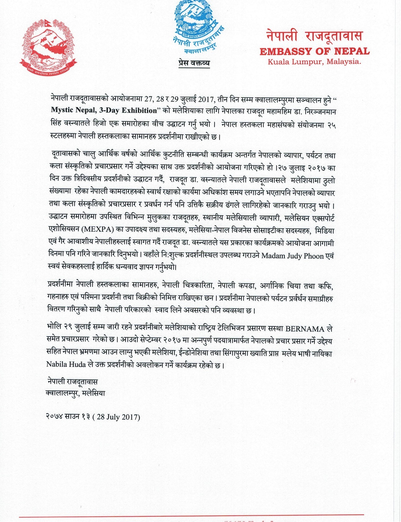 Press Release issued by Embassy of Nepal, Kuala Lumpur regarding Three-Day Exhibition in Kuala Lumpur