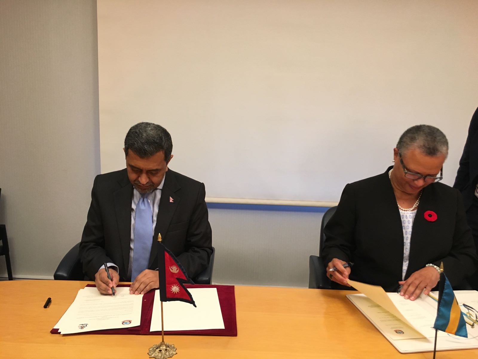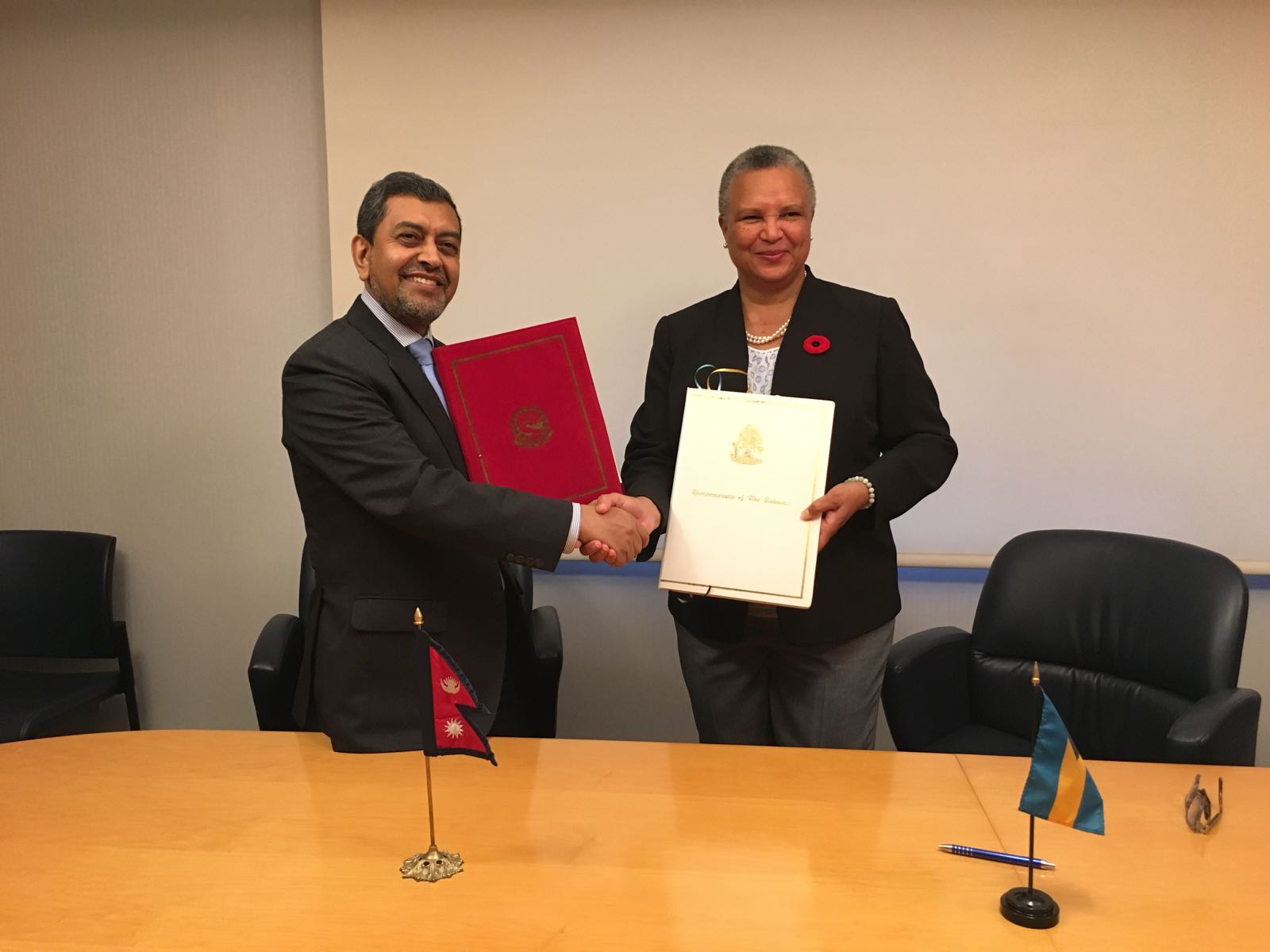 Nepal and The Bahamas established formal diplomatic relations today. Ambassador Durga Prasad Bhattarai, Permanent Representative of Nepal to the United Nations, and Ambassador Ms. Sheila Carey, Permanent Representative of The Bahamas to the United Nations signed an instrument to this effect at a brief ceremony in New York this afternoon.